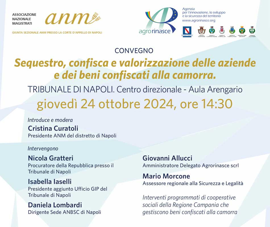 Napoli- Si terrà il 24 ottobre 2024 alle ore 14:30 presso il Tribunale di Napoli, Centro Direzionale- Aula Arengario, il convegno “Sequestro, confisca e valorizzazione dei beni e delle aziende confiscate alla camorra” promosso dall’Associazione Nazionale Magistrati- Giunta sezionale ANM presso la Corte d’Appello di Napoli e da Agrorinasce.