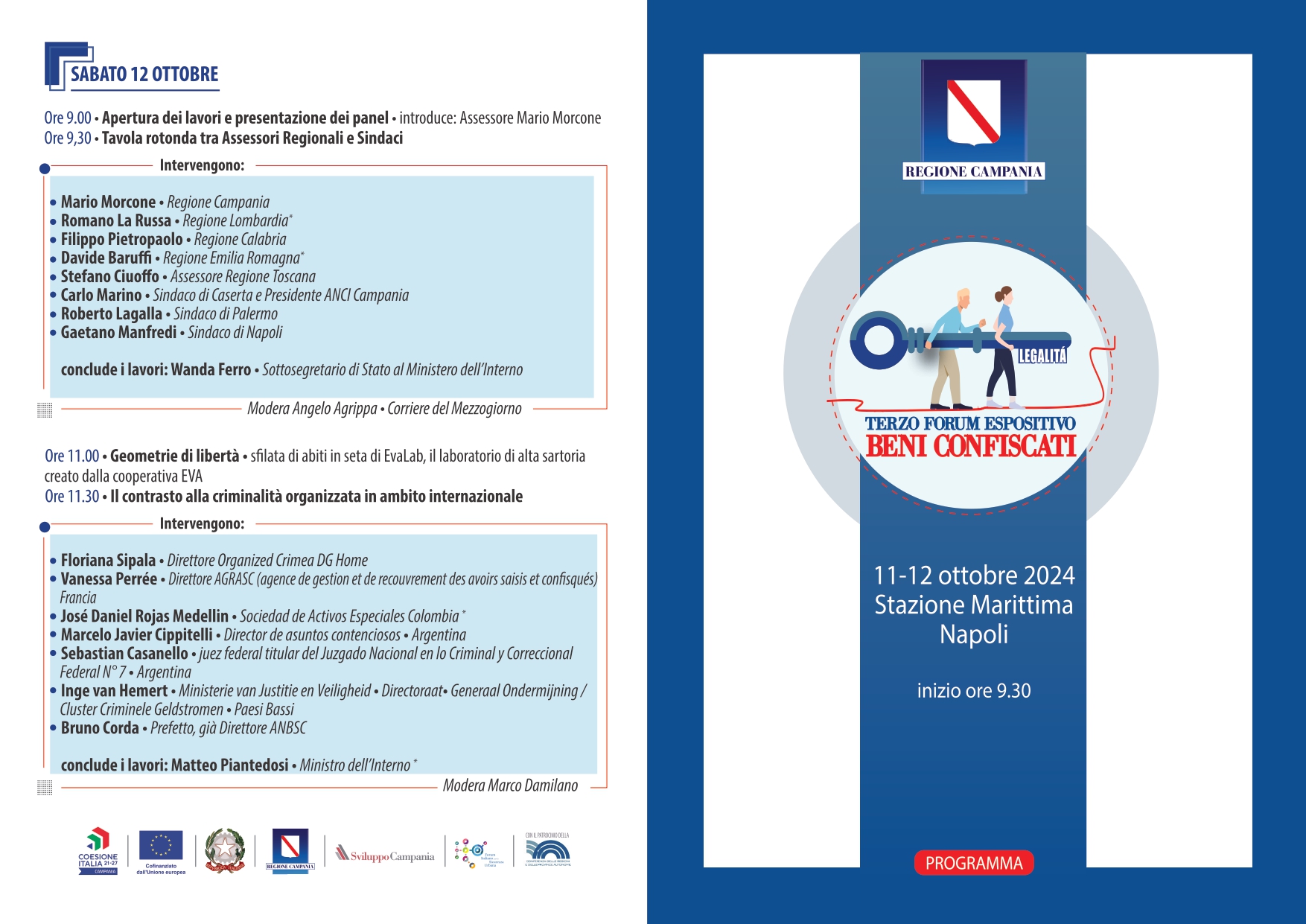 Napoli - Per il terzo anno consecutivo la Regione Campania ha promosso ed organizzato il forum espositivo e due giorni di convegni e dibattiti che si svolgerà alla Stazione Marittima l'11 e 12 ottobre 2024, sui beni confiscati alla criminalità organizzata. Due giorni dedicati alla conoscenza del mondo dei ‘beni confiscati’, con la presenza di tutte le istituzioni pubbliche e degli enti del terzo settore che lavorano per il sociale.
