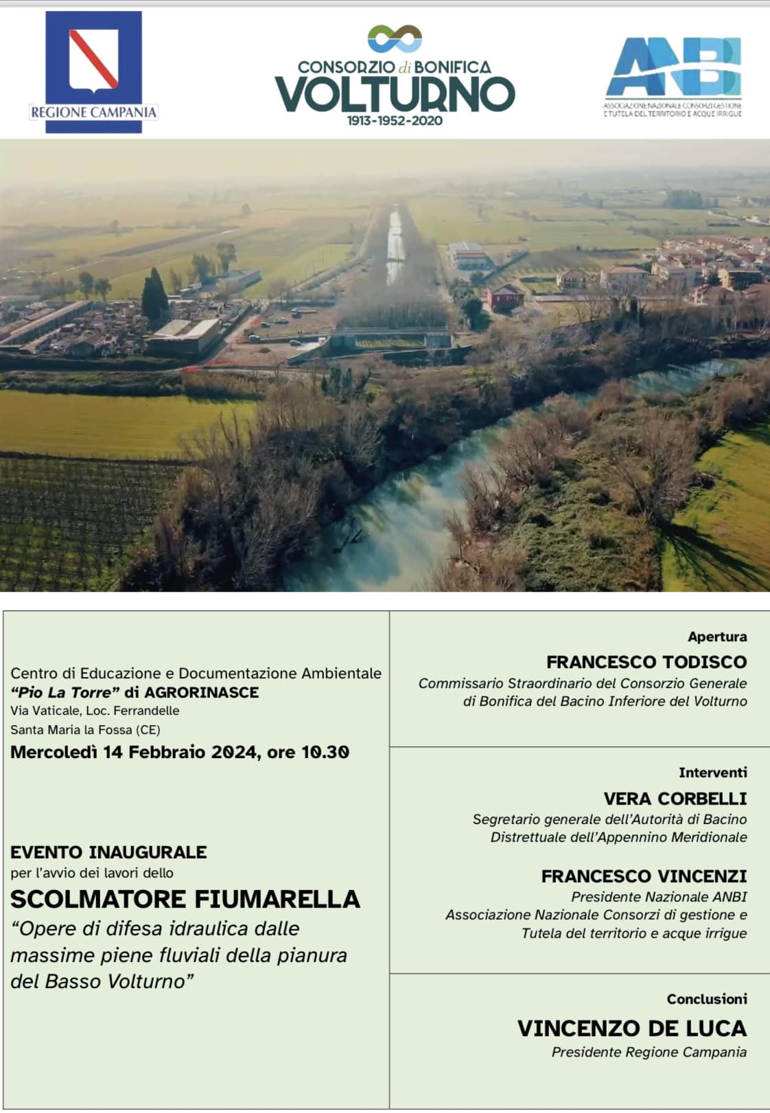 Il Consorzio Generale di Bonifica del Bacino Inferiore del Volturno il 14 febbraio alle ore 10,30 tiene a Santa Maria La Fossa nel Centro di Educazione e Documentazione Ambientale “Pio La Torre” di Agrorinasce
