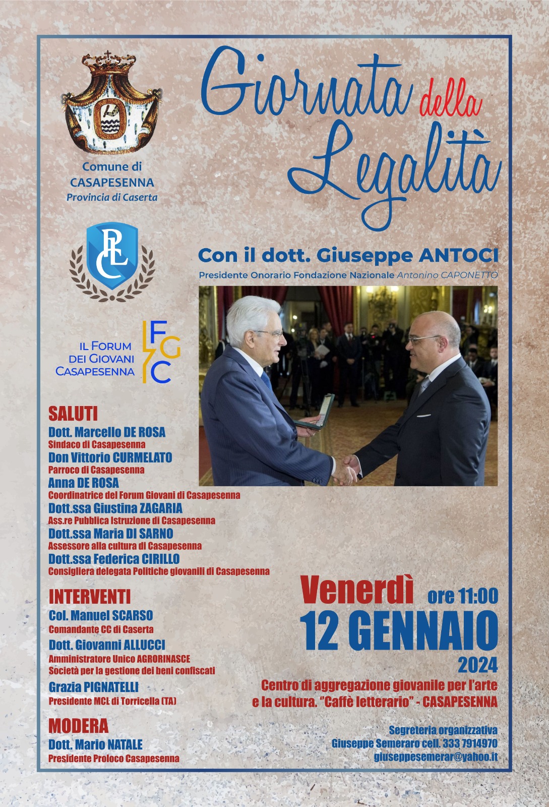 L’Amministrazione Comunale di Casapesenna e il Forum dei Giovani di Casapesenna, con la partecipazione di Agrorinasce, promuovono la “Giornata della legalità”, che si terrà il 12 gennaio 2024 alle ore 11:00 presso il Centro di Aggregazione Giovanile per l’Arte e la Cultura “Caffè letterario” di Casapesenna.